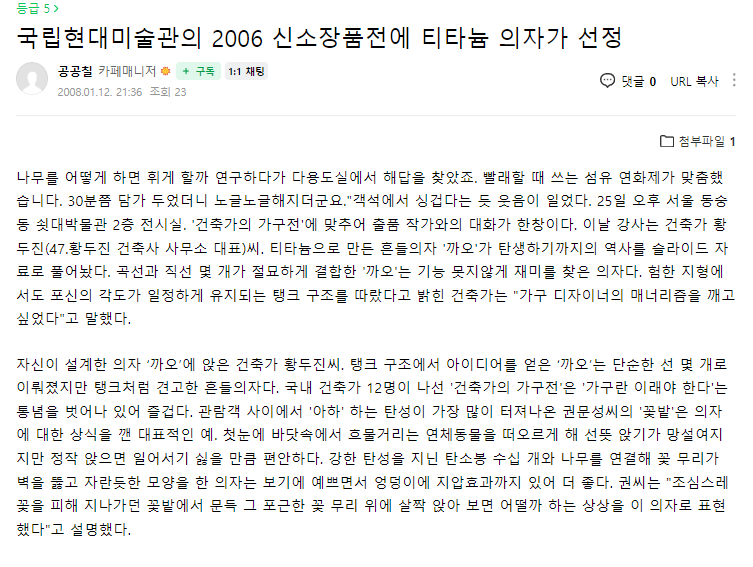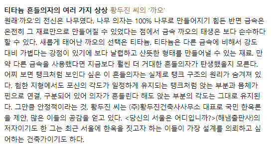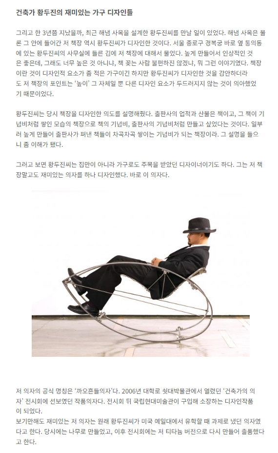 보기만해도 재미있는 저 의자는 원래 황두진씨가 미국 예일대에서 유학할 때 과제로 냈던 의자였다고 한다. 당시에는 나무로 만들었고, 이후 전시회에는 저 티타늄 버전으로 다시 만들어 출품했다고 한다.