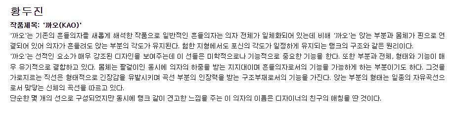 의자의 공식 명칭은 ‘까오흔들의자’다. 2006년 대학로 쇳대박물관에서 열렸던 ‘건축가의 의자’ 전시회에 선보였던 작품의자다. 전시회 뒤 국립현대미술관이 구입해 소장하는 디자인작품이 되었다.